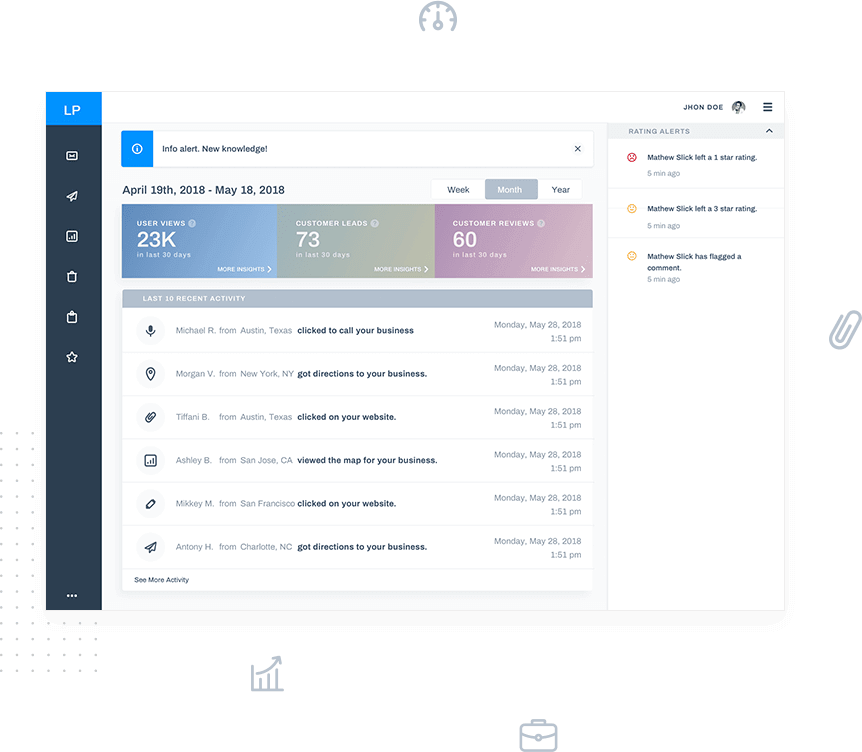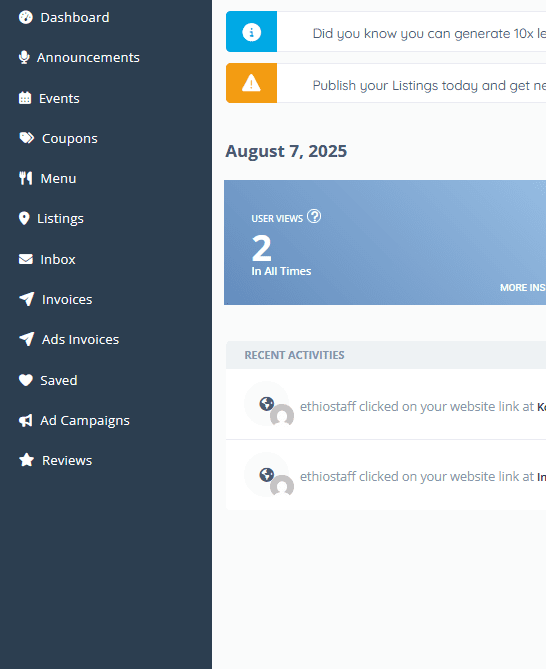 EthioSearch offers intuitive user dashboard for listing owner to get insights on their business performance such as user views, customer leads and custom reviews. Business owner are alerted regarding low-rating for their business to help respond to customer concern on time. Users can manage, and promoting their listing by creating an Ads Campaign.